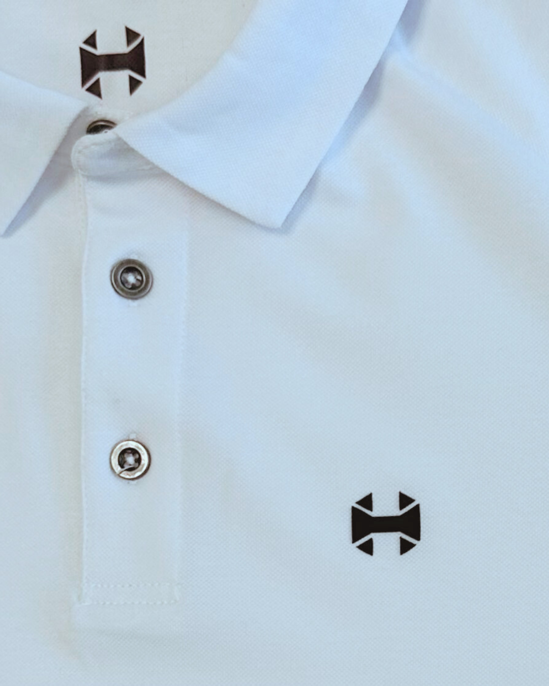 Polo blanco Hundred Wear de algodón en manga corta, con cuello, remates en mangas y bajos, logotipo Hundred y alta calidad. Composición 52% algodón, 45% poliéster reciclado y 3% elastano. Diseño y fabricación exclusiva.
