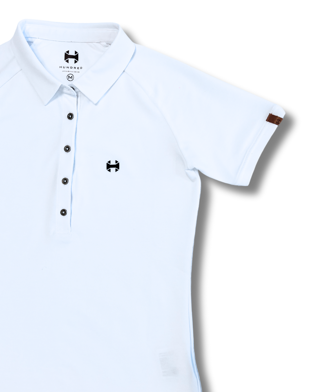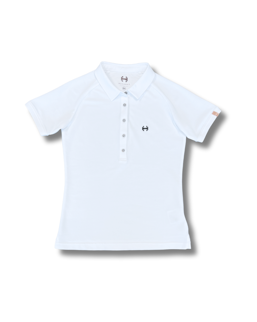 Polo blanco Hundred Wear para mujer de algodón en manga corta, con cuello, remates en mangas y bajos, logotipo Hundred y alta calidad. Composición 52% algodón, 45% poliéster reciclado y 3% elastano. Diseño y fabricación exclusiva.