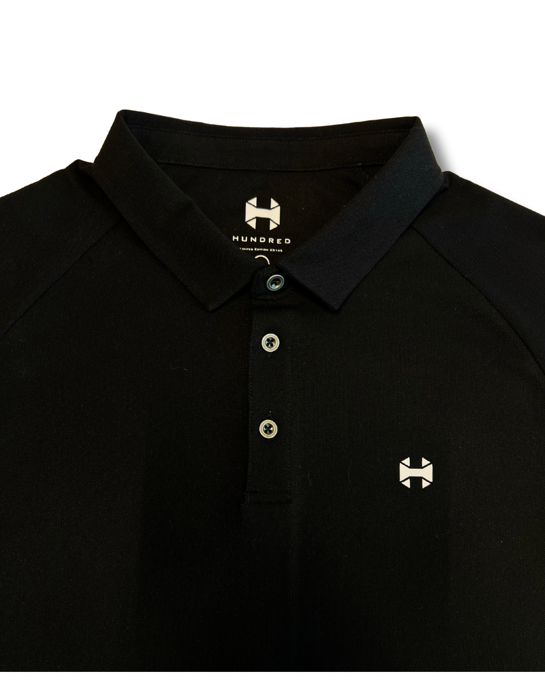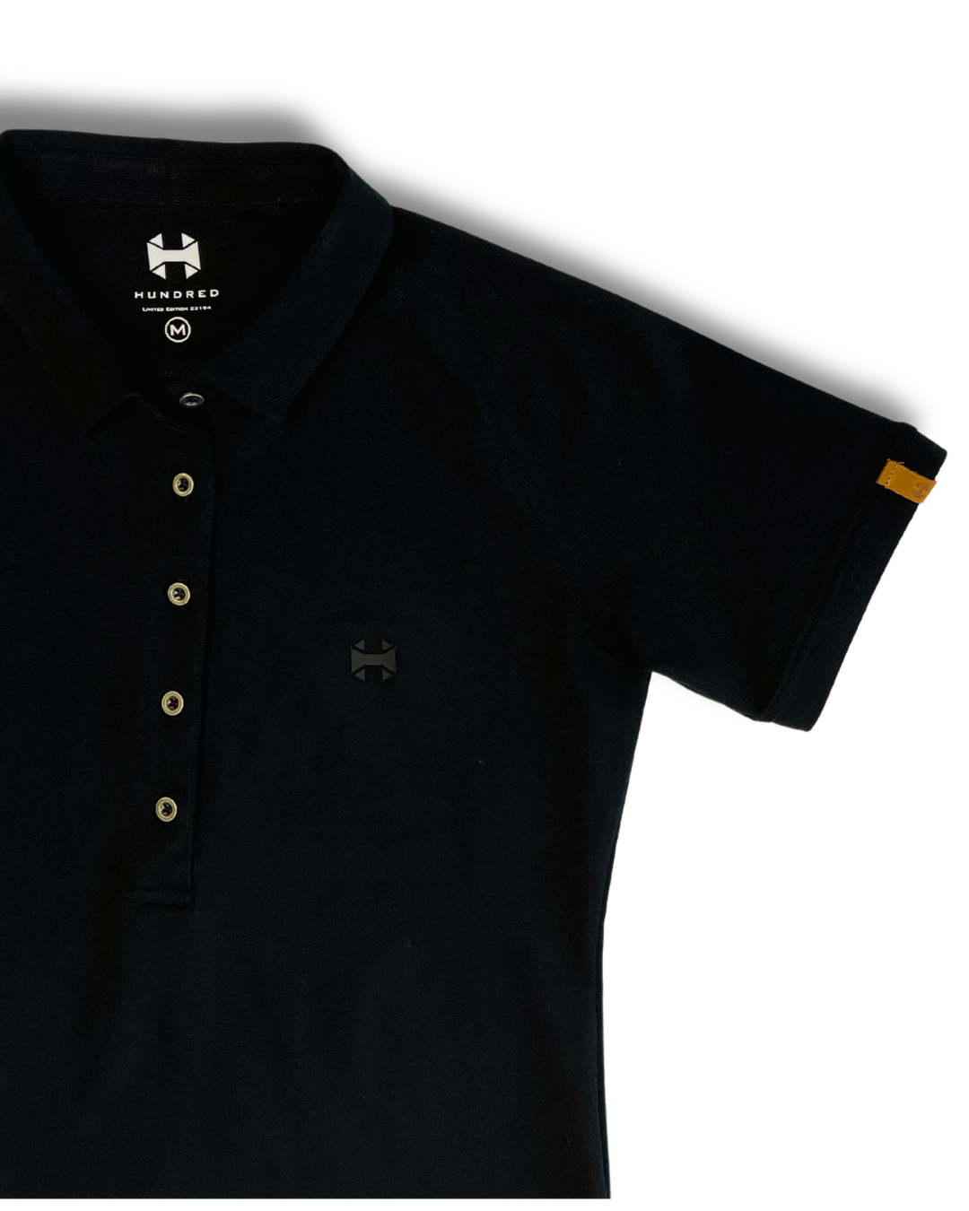 Polo negro Hundred Wear para mujer de algodón en manga corta, con cuello, remates en mangas y bajos, logotipo Hundred y alta calidad. Composición 52% algodón, 45% poliéster reciclado y 3% elastano. Diseño y fabricación exclusiva.